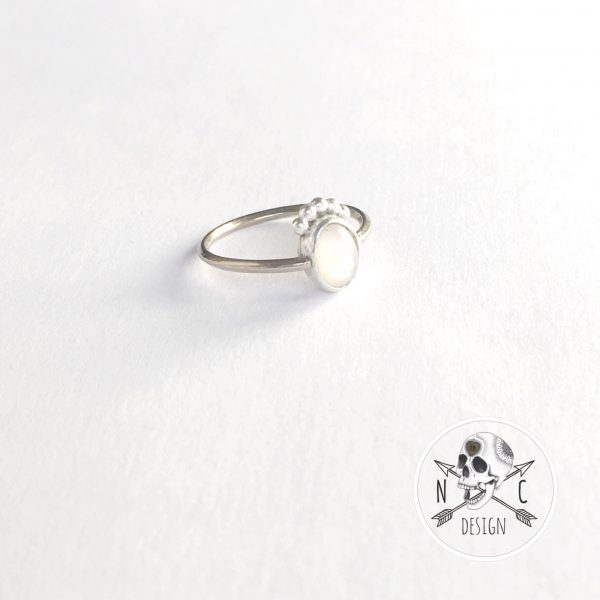 This gorgeous delicate moonstone ring features the additional detail of beading around the top. It can be worn with the peak ring. Made of sterling silver and white moonstone.