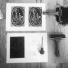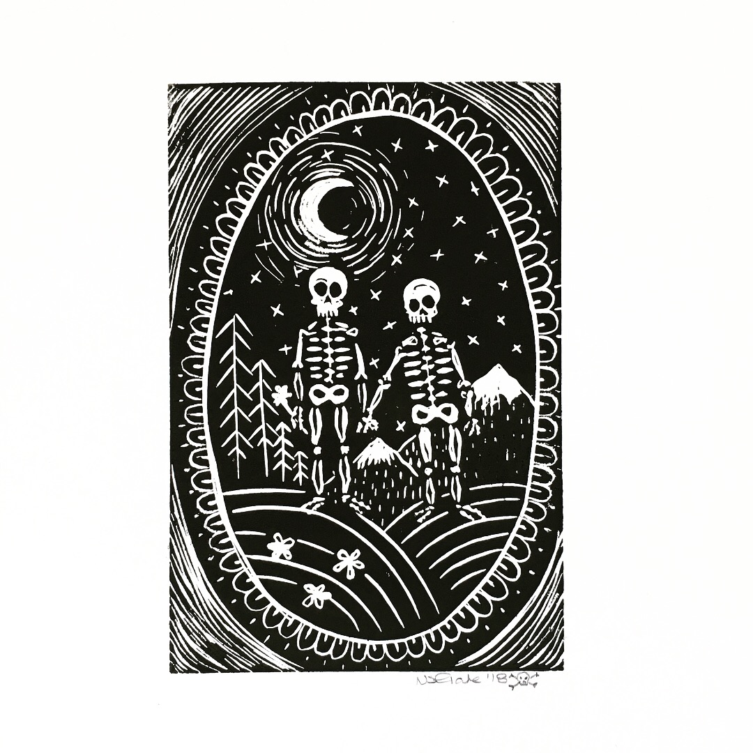 “till death do us part” a lino print of two skeletons. Hand cut lino print.